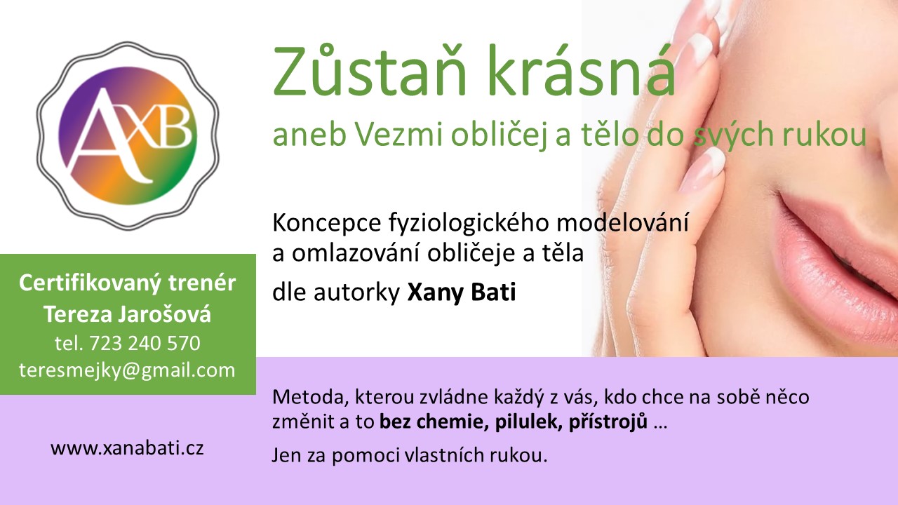 Jsem absolventkou série kurzů Akademie Xany Bati a jsem Certifikovanou trenérkou Koncepce fyziologického modelování a omlazování obličeje a těla podle Xany Bati.